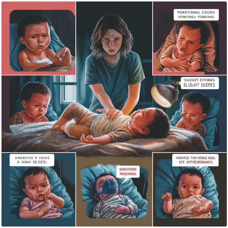 발작성 기침은 심호흡 후 쌕쌕거리는 소리와 함께 구토를 동반하기도 합니다.